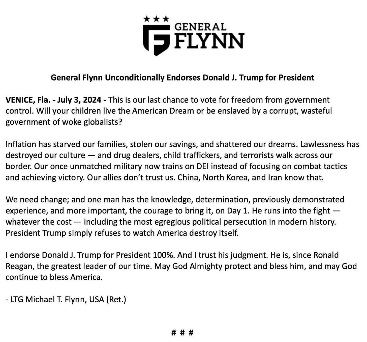 On July 2, a second fake filing appeared — a Form 2 designating Flynn as Trump’s official VP pick. Flynn-aligned influencers circulated it aggressively, trying to create the perception that a Trump-Flynn ticket was a done deal. I again confirmed with RNC sources: it was fabricated. Coordinated. A deliberate ploy.