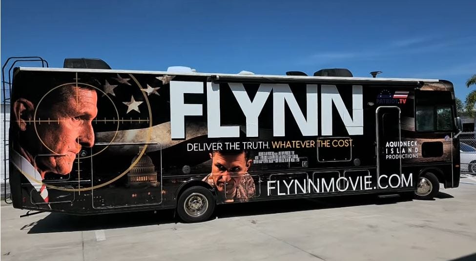 The movie and bus were both well-funded and pre-planned ventures. The production value of the movie is indeed impressive. The bullseye on the right side of Flynn’s face in all of the promotional materials for the film is shocking with the hindsight of the assassination attempt on Trump in Butler, Pennsylvania.