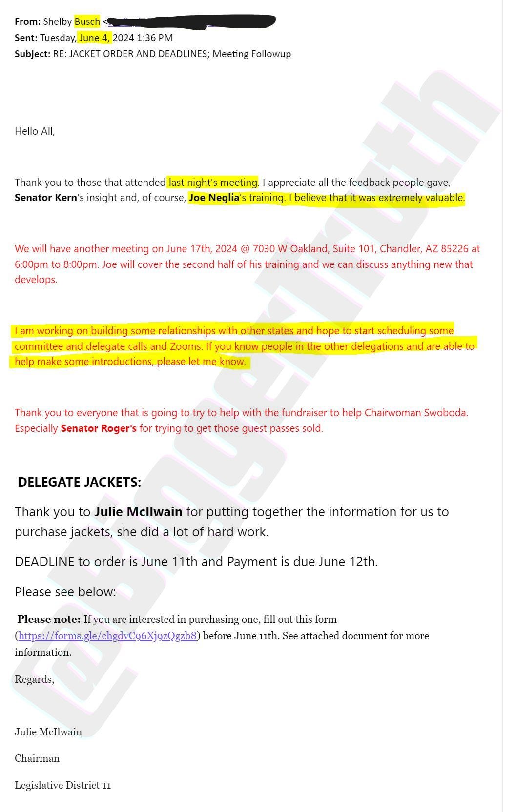 An email Busch sent the next morning, June 4, confirmed the scope of her effort. Sent at 1:36 p.m. from her United Liberty Coalition address, the email thanked attendees for the meeting, praised “Joe Neglia’s training” as “extremely valuable,” and stated plainly: “I am working on building some relationships with other states and hope to start scheduling some committee and delegate calls and Zooms. If you know people in the other delegations and are able to help make some introductions, please let me know.”