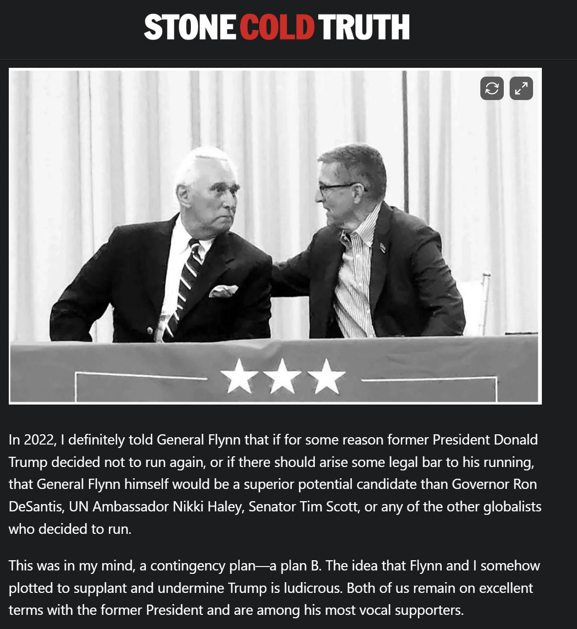 Around the same time, Roger Stone publicly confirmed on his blog and on social media that he and Flynn were running a contingency campaign — a “Plan B” — for Flynn for president “in case something happened to Trump.” In one post, Stone wrote that he had told Flynn directly that if Trump “decided not to run or was legally barred from running, that General Flynn himself would be preferable as a candidate to Ron DeSantis or Nikki Haley or anyone else.” Stone framed it as innocent contingency planning: “Nothing nefarious about it unless you’re a nut.”