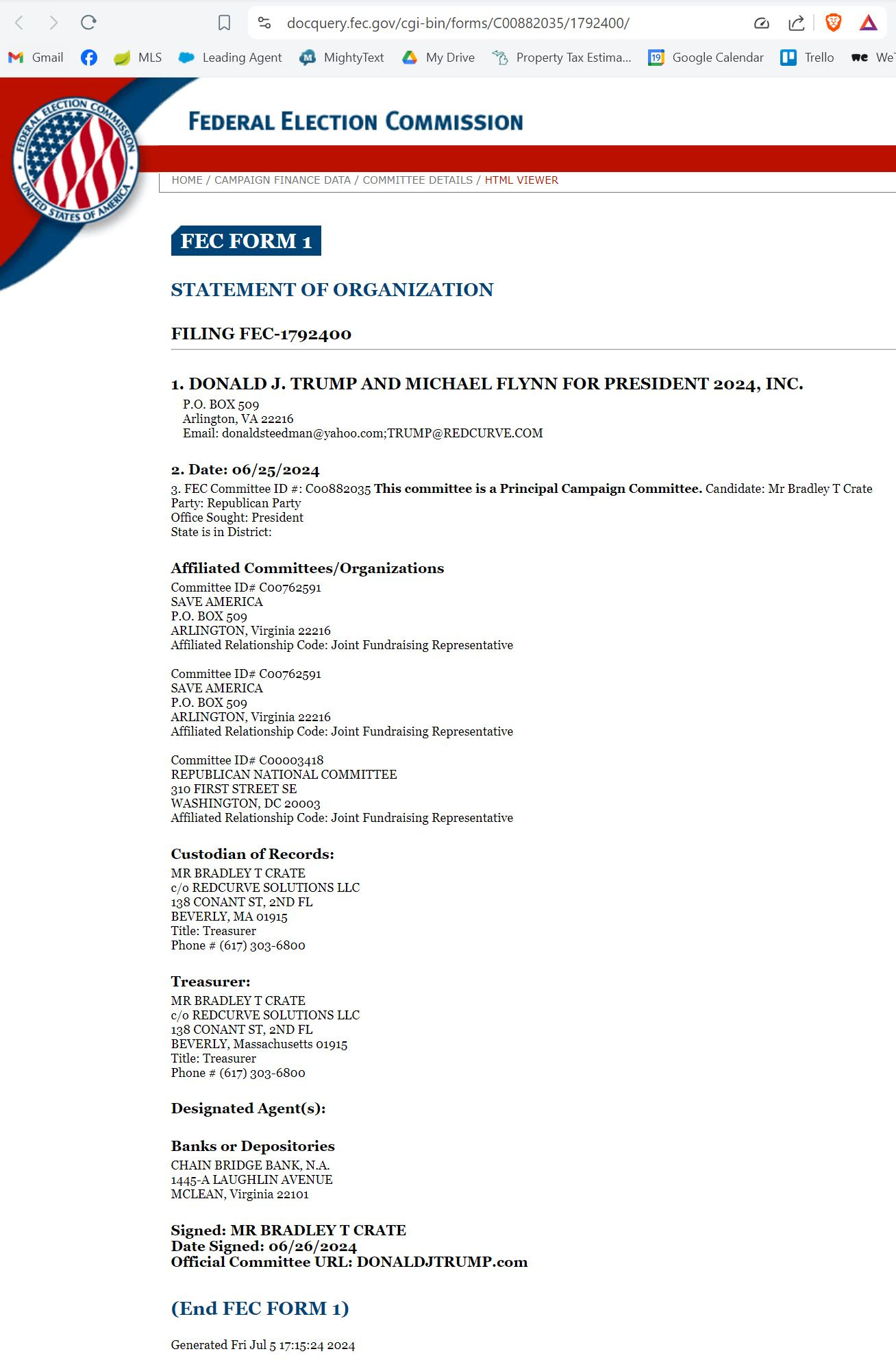 As the convention approached, the psyops escalated. On June 25, a fabricated FEC filing appeared on the official FEC website: a newly created campaign committee titled “Donald J. Trump and Michael Flynn for President 2024, Inc.” It wasn’t discoverable through normal FEC searches, but it existed if you had the direct link. Someone sent it to me. I confirmed it was a forgery and chose not to publicize it — a fake like this, amplified by media, could have created exactly the kind of chaos the plotters needed.