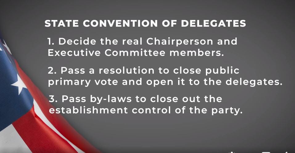 Bigger Truth previously reported on the Karamo team's three-pronged plan for the state caucus on March 2. Their plan was clearly laid out in this screenshot from a video produced by Ken Beyers and promoted on all of the Karamo organization's Telegram channels: