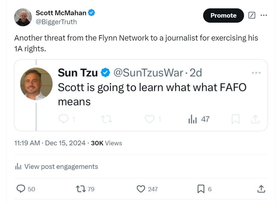 The day after this episode aired live, one of Flynn’s attorneys, Ben Moore of Jacksonville, FL, who goes by Sun Tzu on X, posted this threat:
