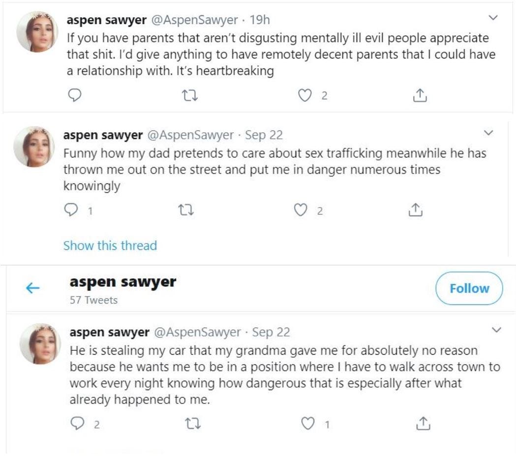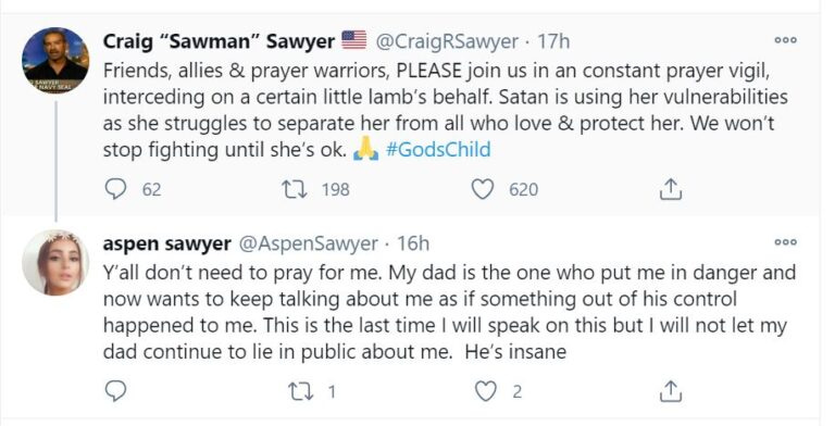 Sawyer’s daughter, Aspen, seems to have made similar allegations publicly on since-deleted social media posts: