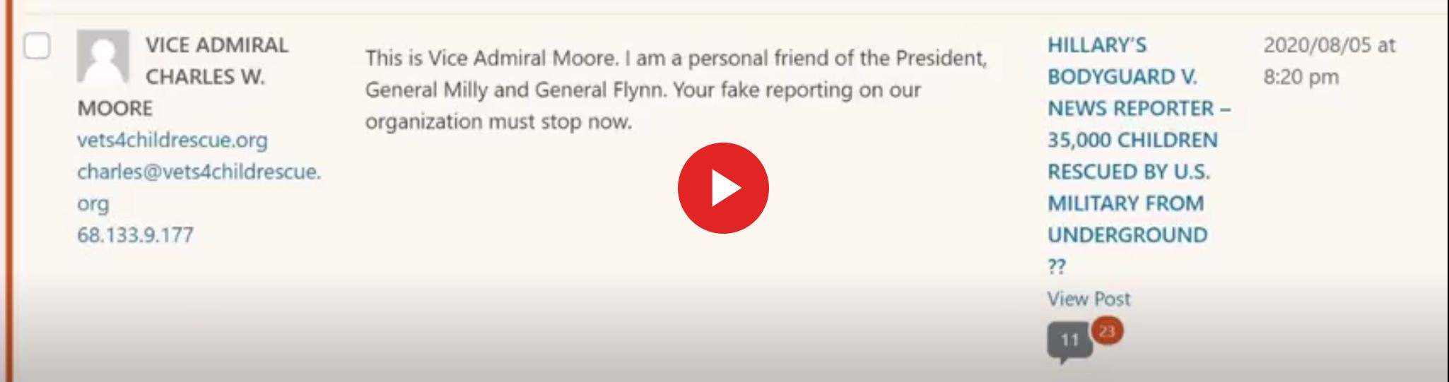 The most fascinating threat that Helmseth shared was from Vice Admiral Charles W. Moore, who says he is a personal friend of the President, General Milley, and General Flynn.