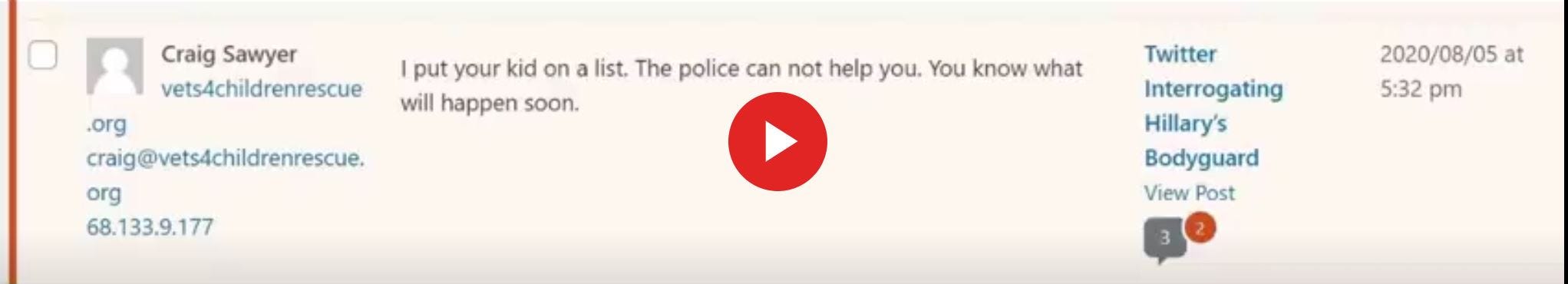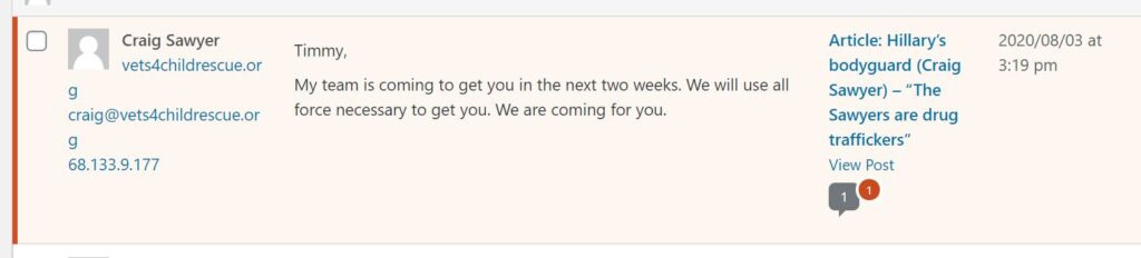 Helmseth also provided screenshots of 20 death threats allegedly posted by Sawyer and his associates, including timestamps and IP addresses. Several of them are quite graphic and include threats against Helmseth’s daughter.