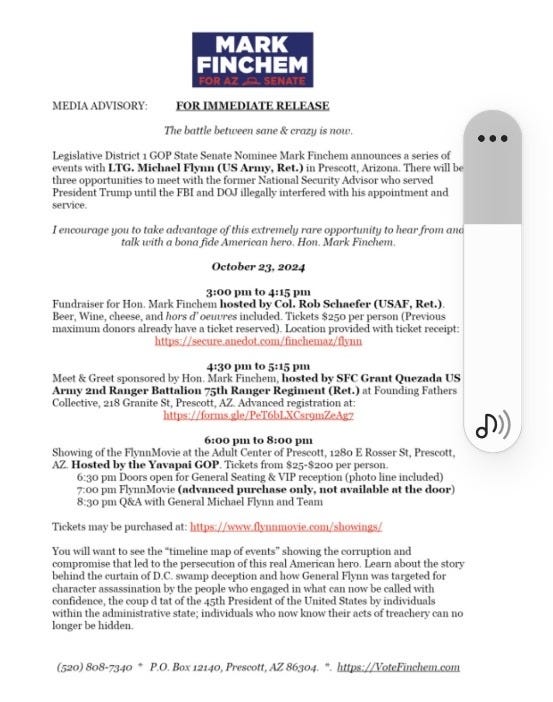 Just a day or two after Finchem’s press conference at which only Flynn-adjacent podcasters appear to have been invited, Finchem issued a press release to announce three fundraising events in his state senate district in Prescott, Arizona - all featuring General Michael Flynn as the key guest.