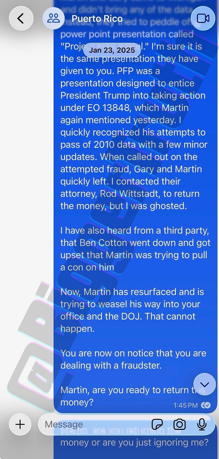 The January 22, 2025 phone call, according to DePerno, included U.S. Attorney for Puerto Rico W. Stephen Muldrow, Venezuelan-born consultant Martin Rodil, and attorney Stefanie Lambert. DePerno has provided Bigger Truth Media with materials from that communication, including notes he kept about the call and screenshots of subsequent Signal messages.