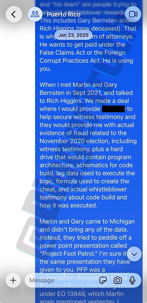 “When I met Martin and Gary Berntsen in Sept 2021, and talked to Rich Higgins, we made a deal where [my client would provide money] to help secure witness testimony and they would provide me with actual evidence of fraud related to the November 2020 election,” DePerno wrote in the January 23, 2025 Signal messages, “including witness testimony, plus a hard drive that would contain program architecture, schematics for code build, lag data used to execute the logic, formula used to create the cheat, and actual whistleblower testimony about code build and how it was executed.”