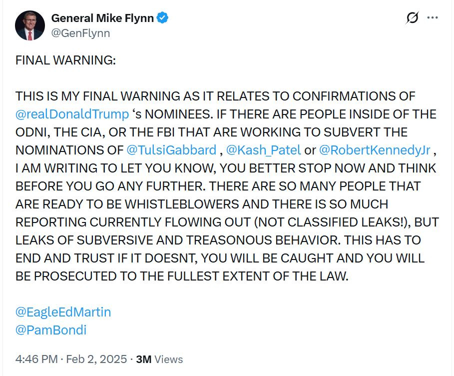 Flynn has been notably defensive of Gabbard on social media, including an allcaps warning in a February 2025 X post: “THIS IS MY FINAL WARNING AS IT RELATES TO CONFIRMATIONS OF @realDonaldTrump’s NOMINEES. IF THERE ARE PEOPLE INSIDE OF THE ODNI, THE CIA, OR THE FBI THAT ARE WORKING TO SUBVERT THE NOMINATIONS OF @TulsiGabbard, @Kash_Patel or @RobertKennedyJr, I AM WRITING TO LET YOU KNOW, YOU BETTER STOP NOW.”