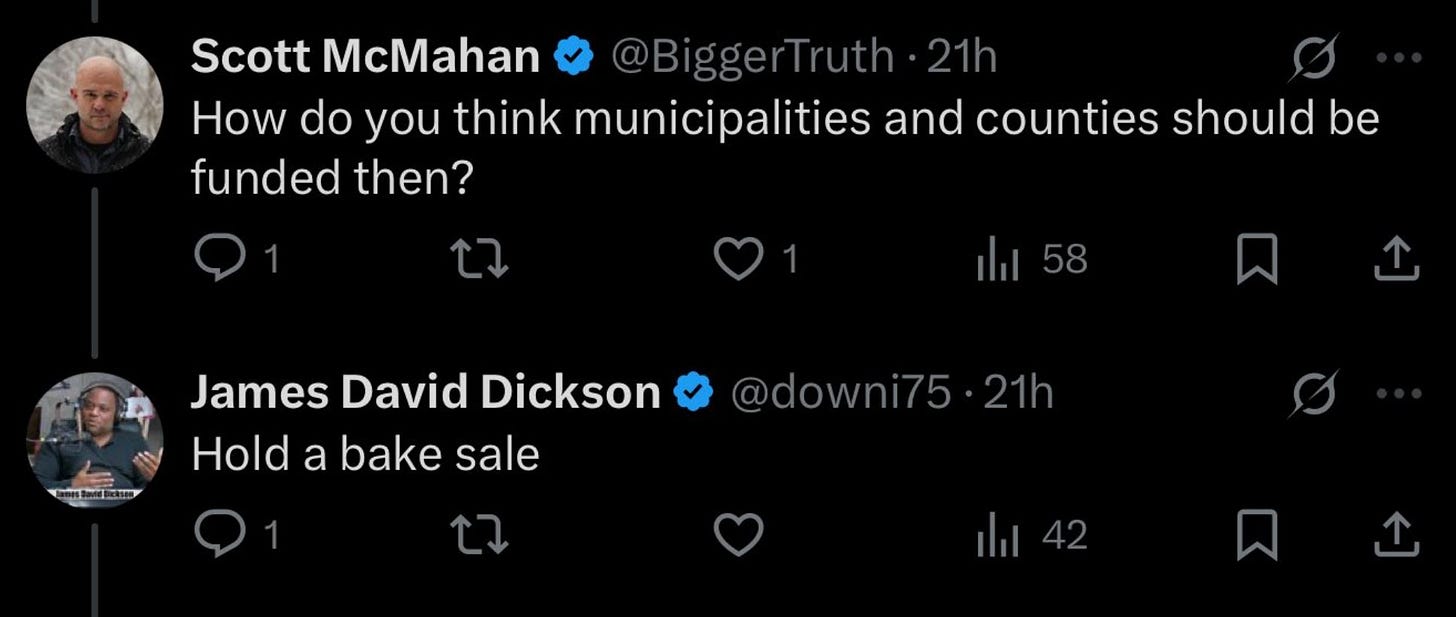 One influencer, James Dickson, a paid contributor for the Betsy DeVos–funded Michigan Enjoyer, took it a step further and suggested municipalities and counties “hold a bake sale.” When I pressed him for details, he blocked me—just as Wagner did.