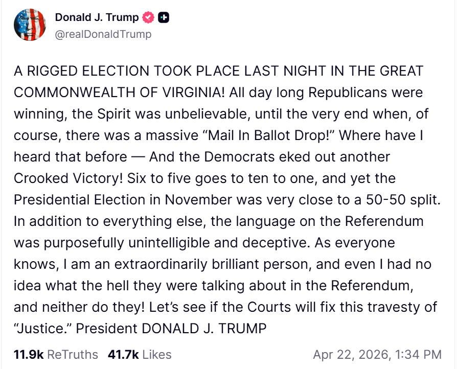 Last week also brought a vivid demonstration of where this all leads. After Virginia voters narrowly approved a troublesome redistricting referendum on April 21, Trump posted on Truth Social that it was “A RIGGED ELECTION” stolen through “a massive ‘Mail In Ballot Drop!’”