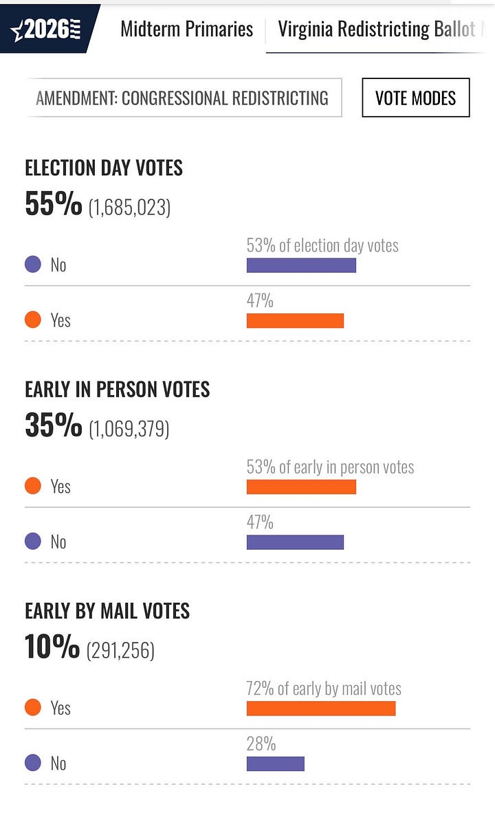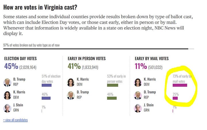 The reality is far more mundane. The Virginia results show that absentee and mail-in ballots favored the “Yes” side by roughly 3:1—almost the identical ratio we saw in the 2024 presidential race in Virginia, where Harris carried early mail votes 73% to 25%. This isn’t evidence of fraud. It’s evidence that Democrats vote by mail at vastly higher rates than Republicans, and that mail ballots are typically counted after election day votes, which means the results shift as those ballots are tabulated.