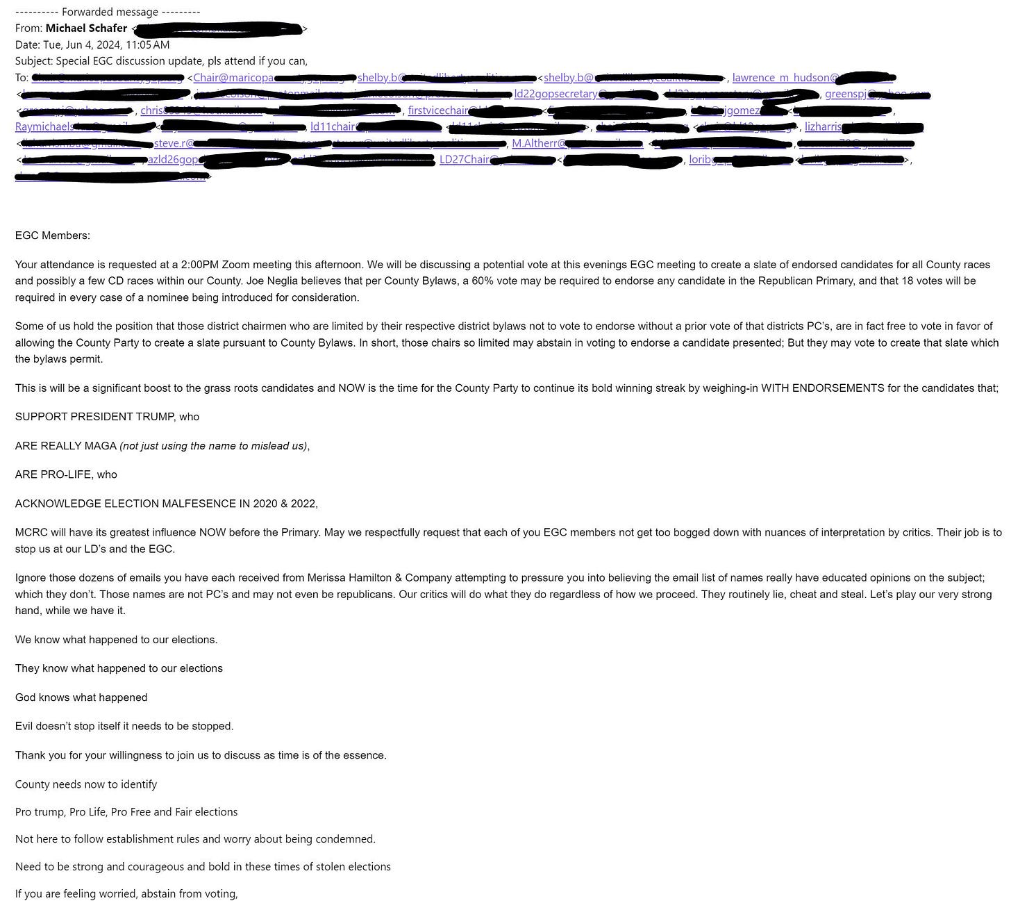 I was forwarded an email last week that I was never supposed to see. It was carefully sent only to their faithful followers within the MCRC Executive Guidance Committee (EGC). Anyone they could not trust was excluded - except they messed up on one email, and it went to what to them was the “wrong” person. Here is the email. It’s a doozy.