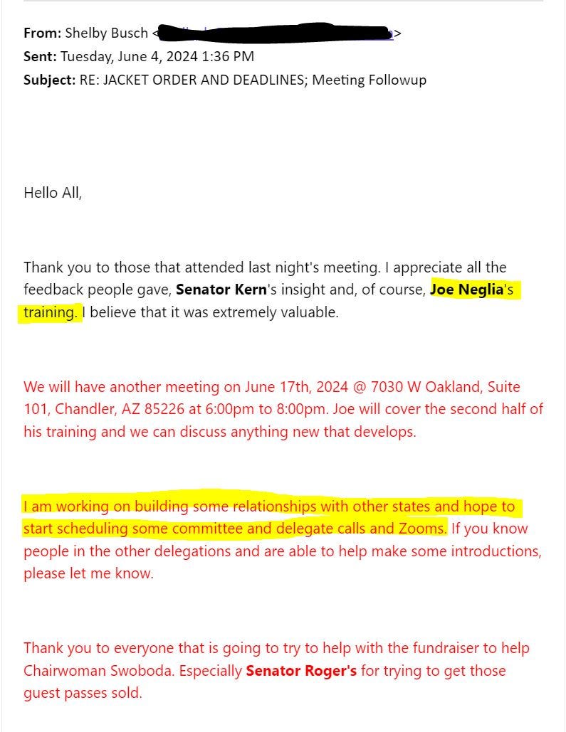 It’s also interesting that Busch emphasizes Joe Neglia’s training. Neglia has never been to a national convention. As I have previously covered, he was actively involved in MCRC efforts to overthrow duly elected legislative district (LD) chairs in LDs 3, 4, 11, 26. He recently said in a Yavapai County GOP meeting, “The MEMBERS rule! Not the chair, not the board, and especially not the parliamentarian. The Yavapai membership has the power to disregard any rule and do things the way they see fit. Breaking rules like that may bring repercussions, but it is the membership’s right to accept that risk.”