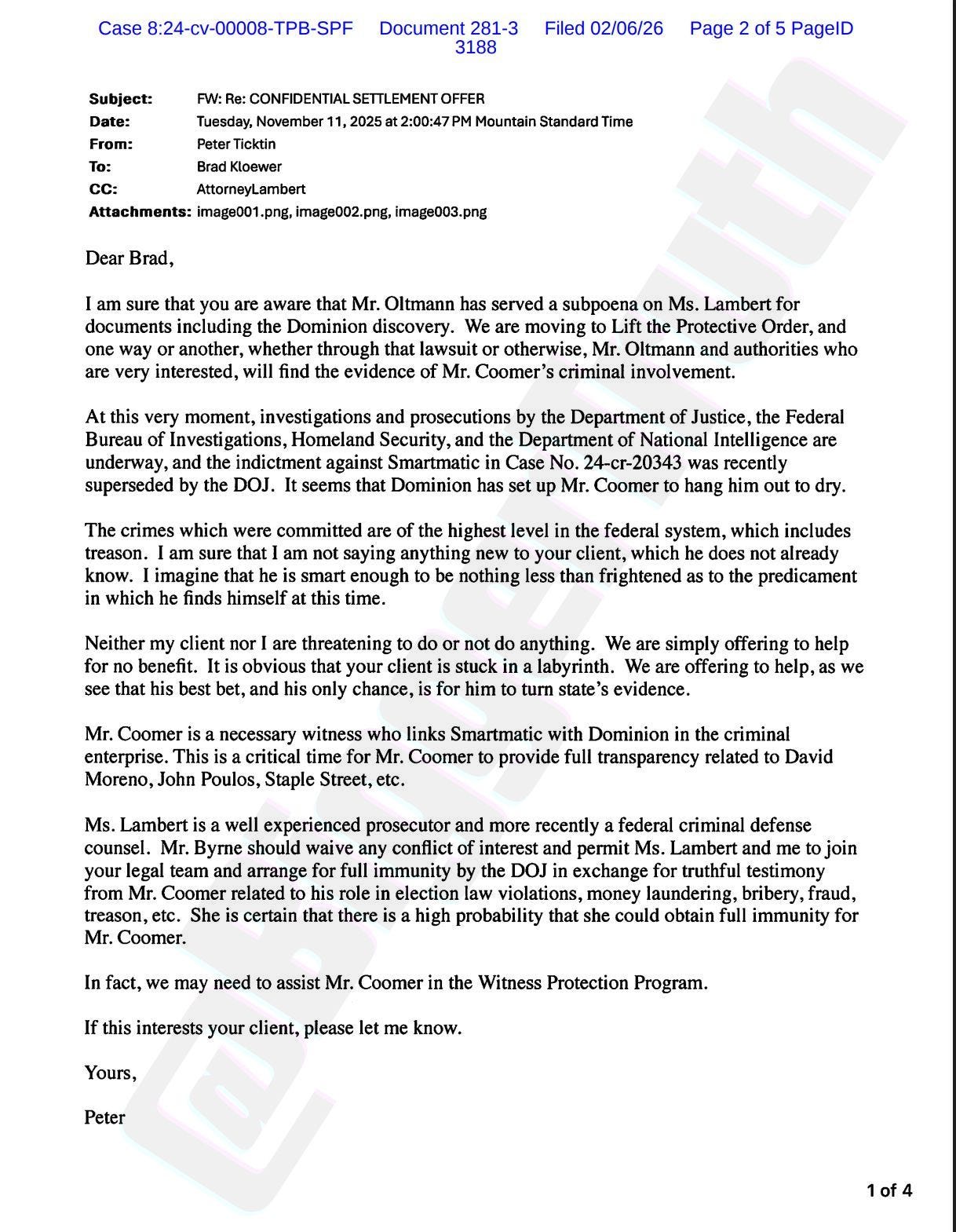 On Nov. 11, 2025, attorney Peter Ticktin emailed one of former Dominion officer Eric Coomer’s lawyers (cc’ing Stefanie Lambert) with the subject line “CONFIDENTIAL SETTLEMENT OFFER.” In it, Ticktin claimed that “investigations and prosecutions” by the DOJ, FBI, Homeland Security, and the “Department of National Intelligence” (sic) were “underway,” then urged Coomer to “turn state’s evidence,” promising to help obtain “full immunity,” and even floating witness protection.