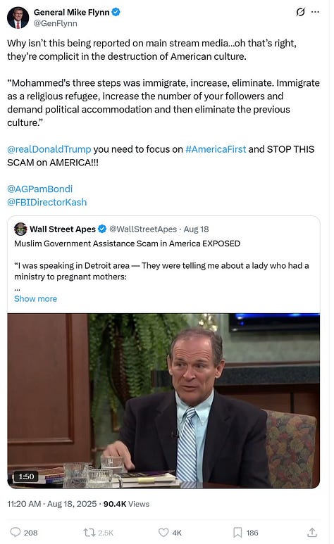 Michael Flynn’s network – a carefully curated and handled collection of influencers on social media and podcasts – was instrumental in propagating the anti-Muslim narrative and in orchestrating the Dearborn fake protest. Flynn himself has a long history of virulent anti-Islam rhetoric; he once described Islamism as a “vicious cancer” inside every Muslim that “has to be excised.”