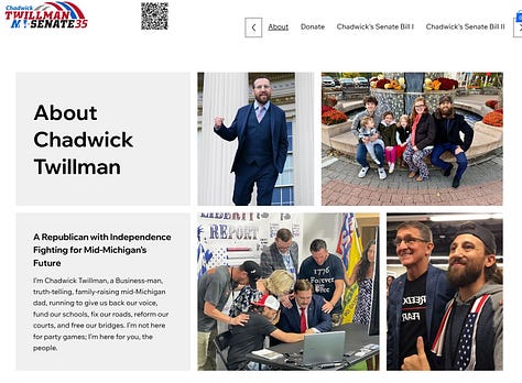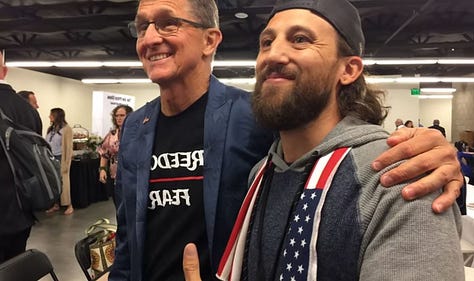 Flynn’s network had direct links to the planning and promotion of Hudson’s Dearborn rally. One notable figure is Chadwick Twillman, an accelerationist Michigan activist running for state senate in the still vacant 35th district. Twillman is a nephew of former CIA Director Mike Pompeo. Twillman was convicted of stabbing someone in 2006 and spent a year in prison, got another conviction for drunk driving in 2008, then befriended Jacob Chansely, the “Qanon Shaman,” around 2018. Twillman became somewhat famous for driving Chansley from Arizona to Washington D.C. for the January 6, 2021 protests.