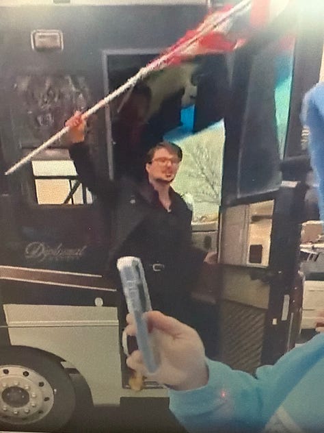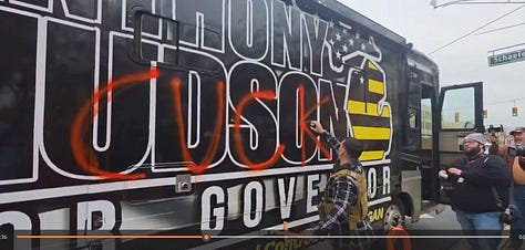 This detail is striking: Scott and Twillman drove Jake Lang and other provocateurs to and from the event in a bus that Scott owned and had paid to have wrapped with Hudson campaign graphics, even after he had quit working for Hudson’s campaign. At the event, Hudson declared repeatedly that the bus had nothing to do with him or his campaign, and by all accounts it appears he was truthful about that, even if he has a long record of being untruthful.