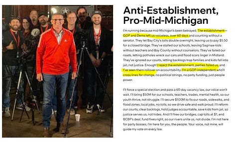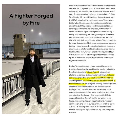 According to his own campaign website, he is very involved in the Flynn network. He quotes Flynn, includes two pictures of himself and Flynn, and posted a pictures of himself laying hands on and praying with one of the guys who allegedly entrapped Tina Peters - Mike Lindell.