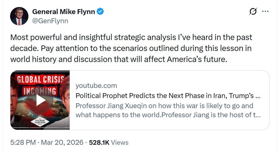 Joe Kent resigned from his position in Tulsi Gabbard’s ODNI March 17 because he ‘‘cannot in good conscience support the war in Iran.” Within hours, Flynn promoted him — placing him on stage at the Waldorf Astoria alongside himself and Candace Owens. On March 20, Flynn endorsed a CCP-based propagandist praised by Alexander Dugin who told Tucker Carlson’s audience that America should accept a “new world order” led by Russia, China, and Iran. On March 23, Alexis Wilkins published hard data showing how the Flynn network is amplified by Russian state media activity. And on March 25, Dan Bongino — using information from my reporting — went to war against Flynn and the network on his show.