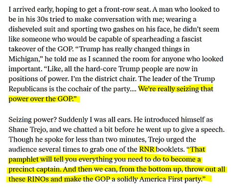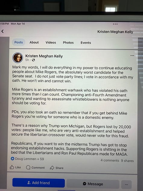 Michigan delegates have been down this road, even beyond their work to elect Slotkin in 2024. In 2022, the Flynn network’s convention influence gave us Kristina Karamo for Secretary of State. She had no campaign or management experience and lost by 600,000 votes but never conceded. I reported in 2024 that members of her own campaign believed the campaign was intended to lose by Karamo’s intelligence-linked handler, Mike Labadie.