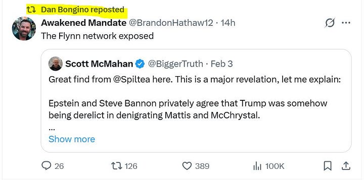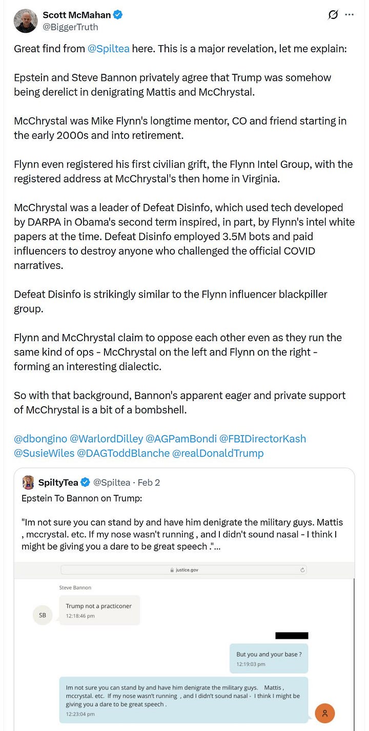 On March 25, Bongino discussed nearly exactly a post of mine that he reposted last month, showing the mentor-mentee relationship between Stanley McChrystal and Mike Flynn and how McChrystal’s Defeat Disinfo organization was used to amplify narratives and destroy opposition, especially during COVID and the 2020 election cycle on behalf of Democrats.